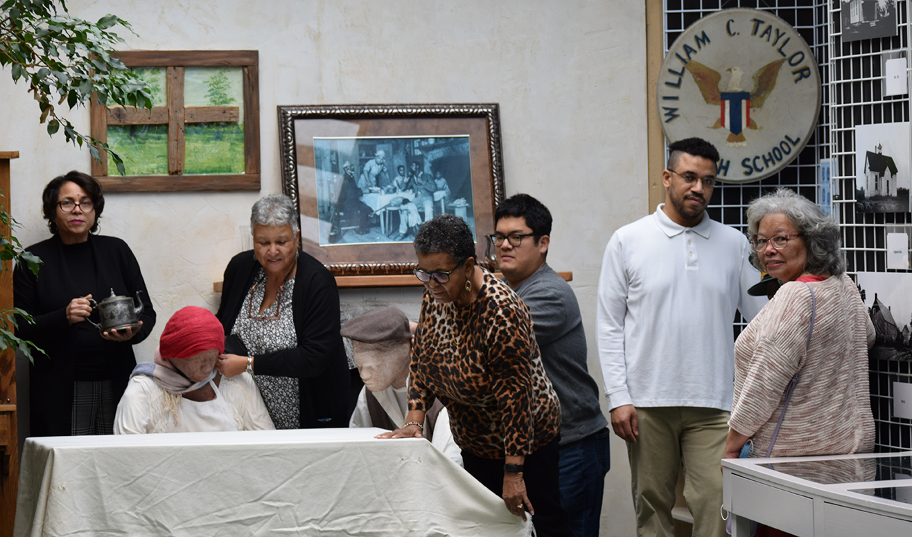 Museum staff fine-tune an exhibit; Left to right are Norma Logan, Director Karen Hughes White, Christine Taylor Lewis, Robert Doane, Jerry Williams, and Angela Davison.